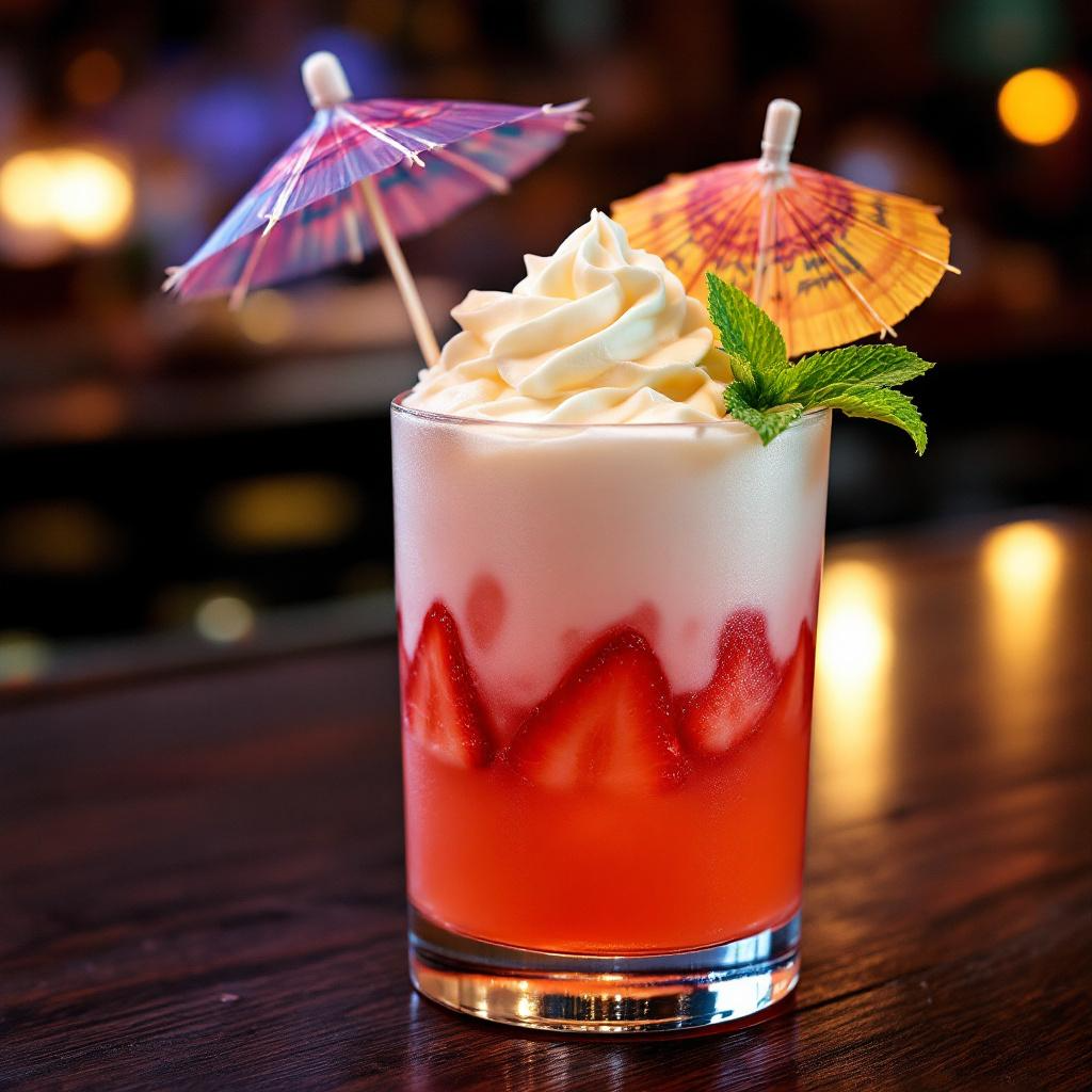 A flirtatiously sweet non-alcoholic cocktail that opens with fresh strawberry purée and crushed watermelon juice, brightened with a splash of zesty tangerine. A swirl of coconut cream adds tropical softness, while a touch of warm vanilla syrup rounds it out with mellow sweetness.